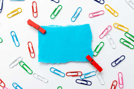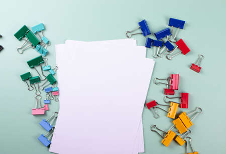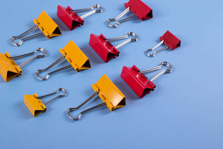 Colorful Paper Clips on a Blue Background. office business tool. Items for the Office and Doing Business, Accounting, Business Administration.