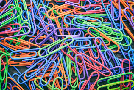 Many colorful paperclips spread on a surface