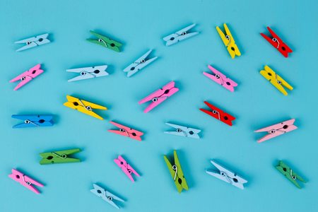 Multicolored bright clothespins on blue background