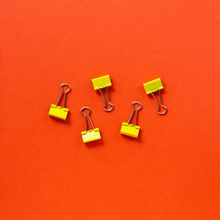 Yellow stationery clips on a bright red background.