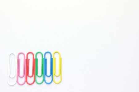 Colorful office paper clips on white background.