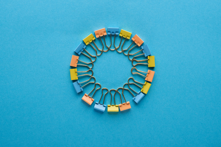 top view of colorful paper clips on blue
