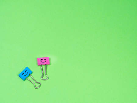 Funny blue and pink smile metal binder clip or multicolored paperclip on green background with copyspace for text