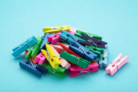 many colored clothespins on a blue background, as a substrate, pin clothes peg