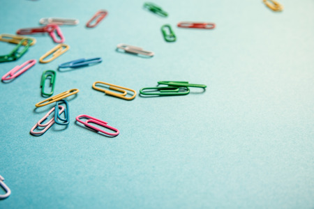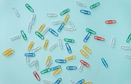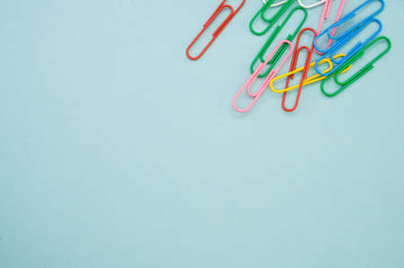 Colored paperclips randomly arranged on blue paper with copy space.