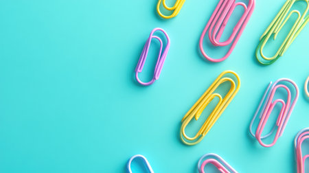 Closeup of colorful paper clips scattered randomly on clean white background, simple school supplies layout, vibrant colors, back to school concept