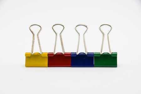 A vibrant collection of colorful binder clips arranged neatly on a clean white background. Perfect for showcasing office organization and creative stationery use.