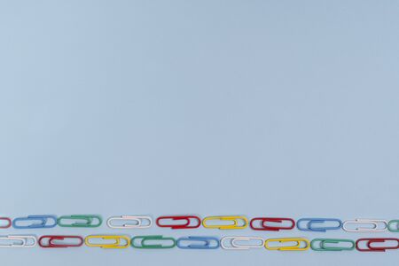 Colored paper clips on blue background with copyspace