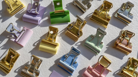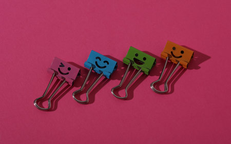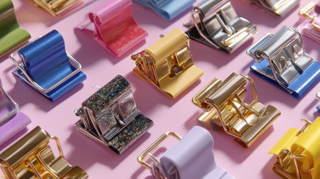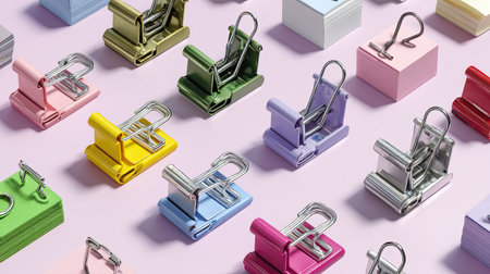 A vibrant and stylish arrangement of colorful binder clips and paper notes on a pink background, perfect for enhancing office aesthetics and productivity.