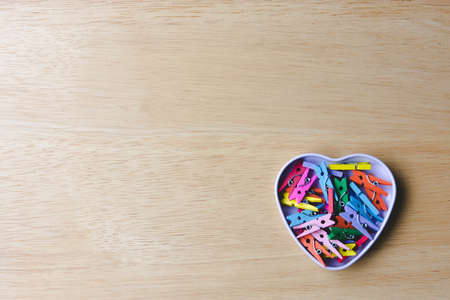 Wooden clothes pins In heart-shaped tins, put on a wooden table,Valentine concept.