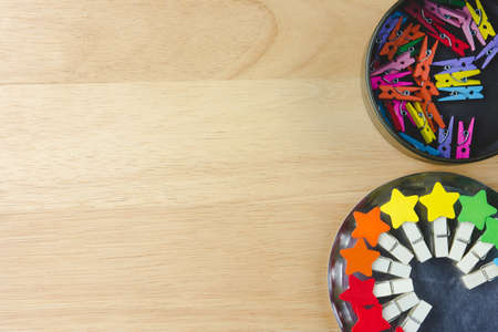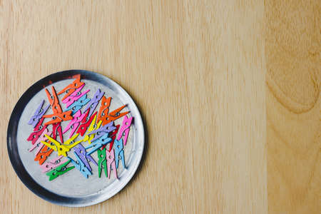 Set of wooden clothes pins on wooden table