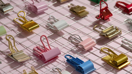 An artistic arrangement of various colorful paper clips on a grid with a soft pink background, perfect for office organization and creative projects.