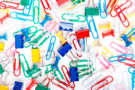 Multicolored paper clips and thumbtacks on a white background