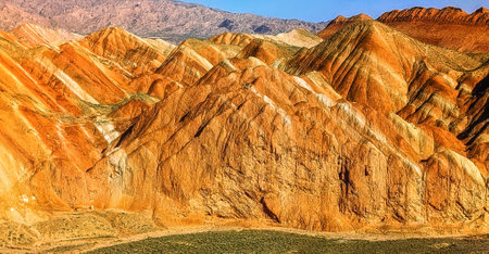 View of Rainbow Mountains Geological Park. Stripy Zhangye Danxia Landform Geological Park in Gansu Province, China. Valley on a Sunny Day.
