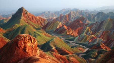 Stunning view of colorful layers in the Rainbow Mountains, showcasing vibrant earth tones and unique geological formations under soft morning light.