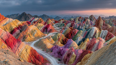 Stunning landscape showcases vibrant rainbow hills in Zhangye Danxia, China, under a moody sunset sky. A breathtaking geological wonder.