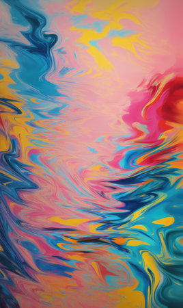 Abstract fluid art with vivid swirls of pink, blue, yellow, and orange, creating a dynamic, vibrant composition.