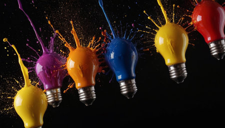 Light bulbs exploding with splashes of colorful paints against a black background, merging illumination with art. AI generation
