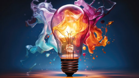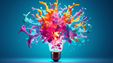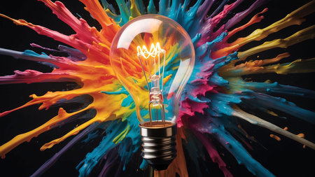 A lightbulb explodes with vibrant colors, symbolizing creative energy.