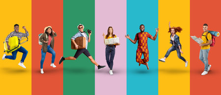 Multiple people joyfully jumping in colorful backgrounds showcasing diversity