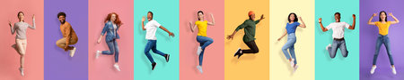 Diverse group of people jumping joyfully against vibrant colored backgrounds