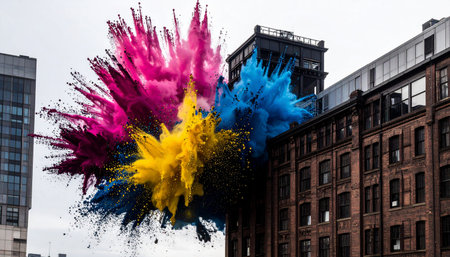 Dramatic explosion of colorful powder in industrial setting