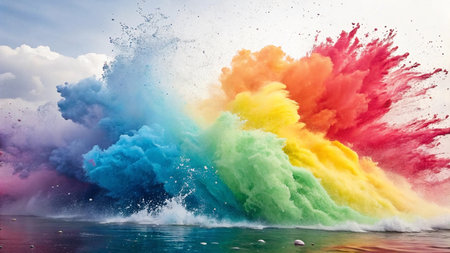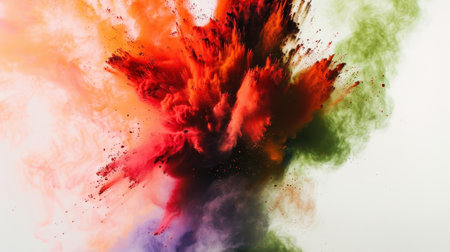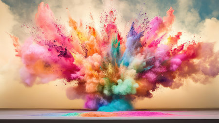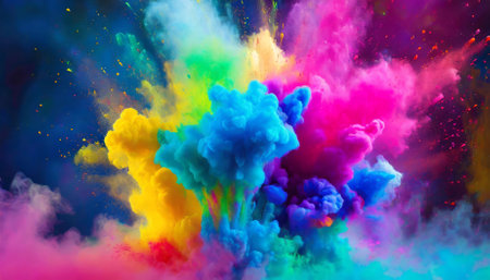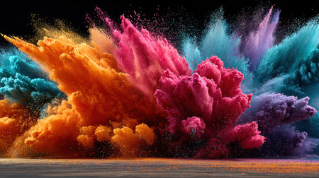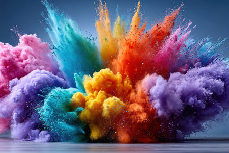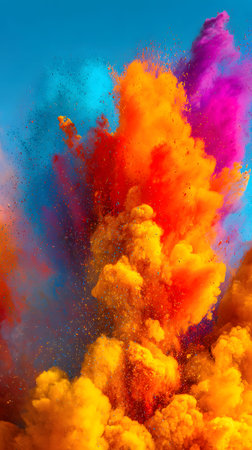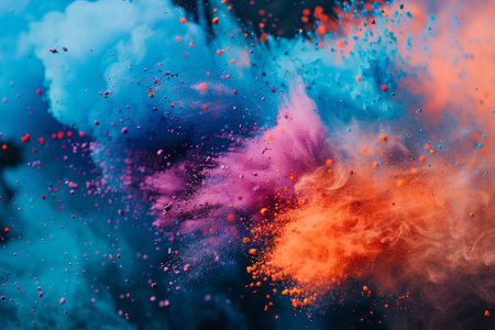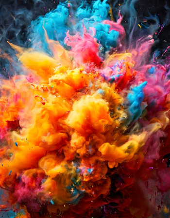 A vivid array of colored powders bursts into the air, creating a dynamic scene filled with energy and festivity, reflecting joy and celebration.