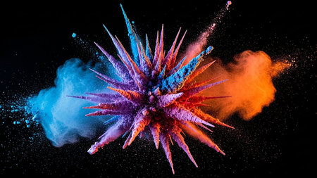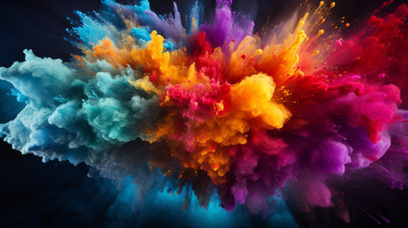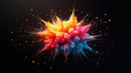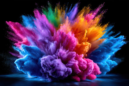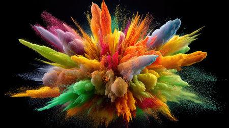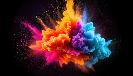 Vibrant explosion of multicolored powder against a black background, creating a dramatic burst of energy