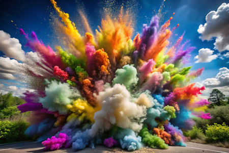 Colorful powder explosion on road, vibrant cloudscape background