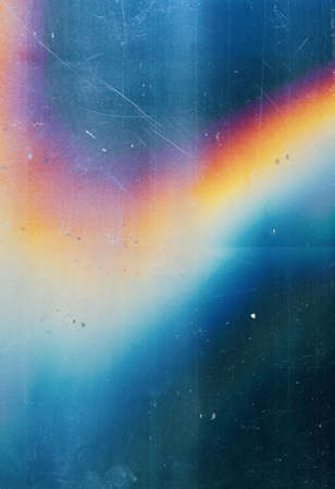 Lens flare background. Dust scratches texture. Blue distressed faded stained screen with smeared dirt noise blur colorful orange rainbow glow defect.