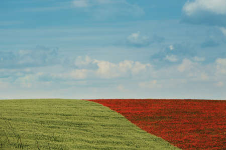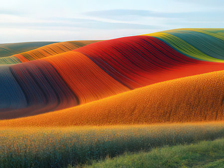 Colorful striped agricultural fields in red, yellow, and green form a vibrant pattern under a bright blue sky with...
