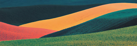 An artistic rendering features undulating terrain in vibrant shades of blue, purple, and yellow. The composition showcases a stylized landscape with a soft, textural appearance. A clear sky provides a backdrop, creating a visually appealing scene suitable for various commercial applications.