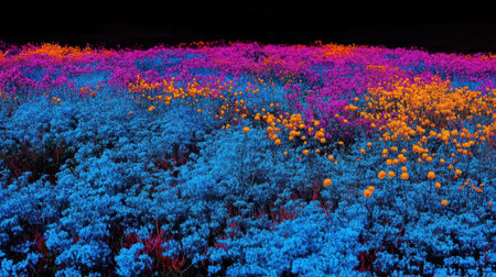 A stunning landscape featuring a field of vibrant flowers in shades of blue, orange, and purple, creating a mesmerizing visual under a dark sky.