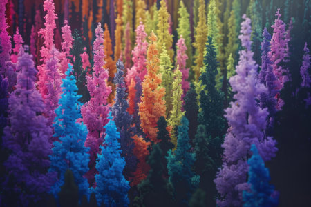 A close-up of a vibrant and dreamlike forest filled with abstract colorful trees.
