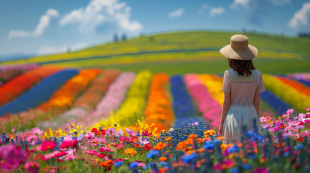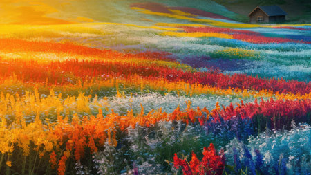 A picturesque landscape featuring a vibrant rainbow of flowers stretching across rolling hills with a small wooden cabin nestled within the scene.