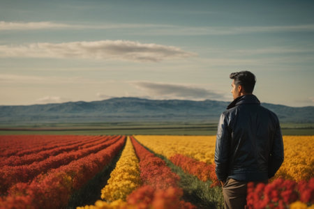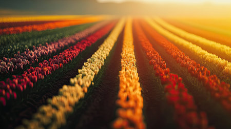 Experience a breathtaking view of vibrant tulip fields during sunset, showcasing rows of colorful blooms stretching into the horizon, embodying natural beauty.