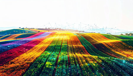 Colorful stylized fields featuring various crops with vibrant textures in rolling landscapes