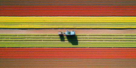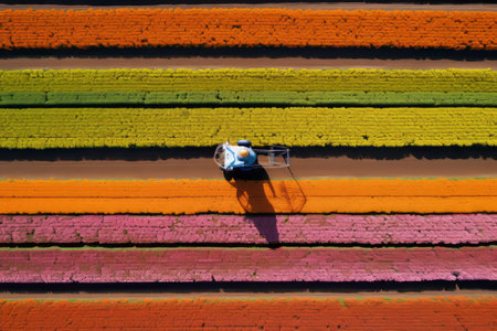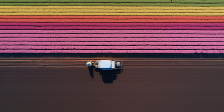 Mesmerizing drone view at flower fields in the Netherland, created with generative AI