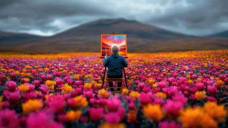 A person sits on a chair, painting a colorful landscape in a field filled with pink and yellow flowers. Majestic mountains rise in the background under a cloudy sky.