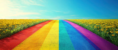A vibrant rainbow road leads to horizon, symbolizing hope and future in sunny landscape