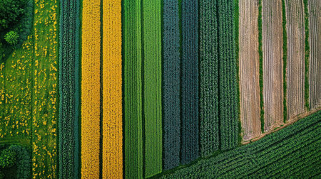 Aerial drone shot of crop rotation fields, highlighting efficient agricultural practices