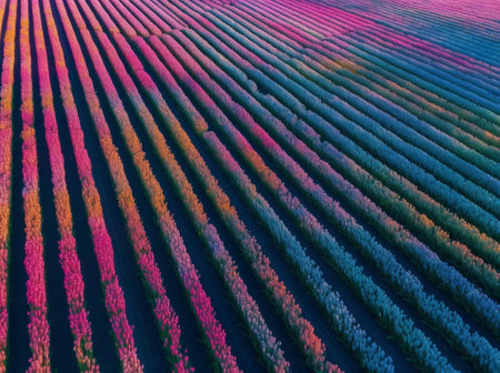 A vast field of meticulously arranged rows of colorful flowers in bloom, bathed in the warm, golden light of a setting sun.
