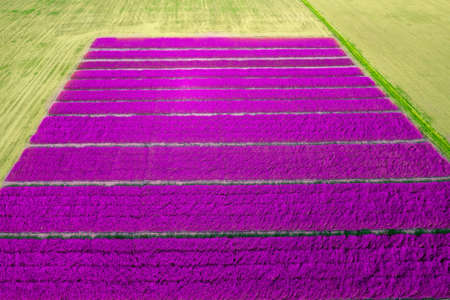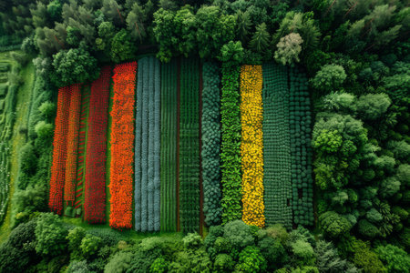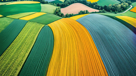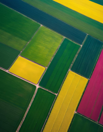 An Aerial view of vibrant agricultural landscape with colorful crop sections