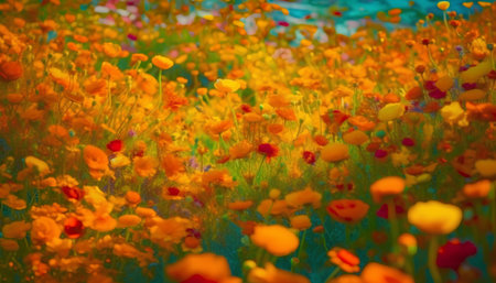 Blooming wildflowers stretch towards the vibrant sunset in a serene meadow filled with colors