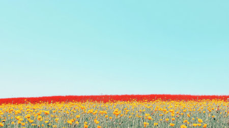 A vibrant field of yellow and red flowers stretches under a clear blue sky, creating a stunning natural landscape. Ideal for spring and summer themes.