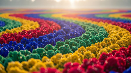 A vast field of vibrantly colored flowers arranged in curved, concentric rows of red, blue, green, and yellow, creating a rainbow effect under bright sunlight.