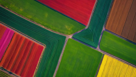 Aerial view of vibrant tulip fields stretching to the horizon, painting the landscape with a kaleidoscope of colors
