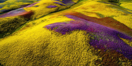 Vibrant colors spread over hills as wildflowers bloom in spring. Yellow and purple blossoms create a stunning landscape, showcasing nature's beauty in a scenic outdoor setting.