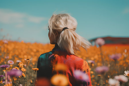Girl with blonde hair in a field of flowers. Girl in a field of flowers
