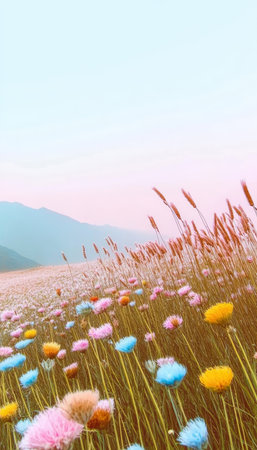Serene Dreamy Wildflower Meadow with Pastel Hues, Tranquil Beauty, Blooming Flowers and Mountains